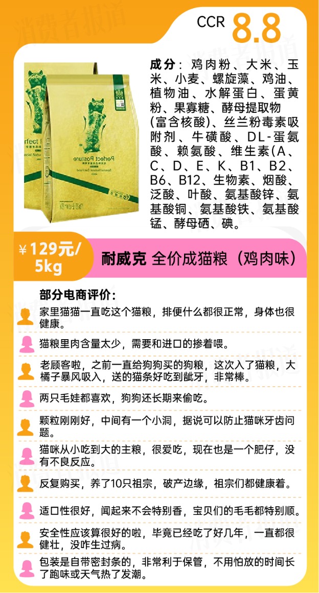 该款猫粮采用的是中空颗粒设计,据说是考虑到成猫口腔及进食习惯,这个小细节也受到不少铲屎官的称赞,他们表示“是甜甜圈的形状,看起来还蛮可爱的”“大小正好,中间空心一咬嘎嘎嘎脆”“特别针对猫口腔设计的颗粒,小而轻脆更易咀嚼”等。耐威克该款猫粮是鸡肉味,适口性较佳,消费者评价“家里猫主子的固定粮,应该是非常适合它的口味”“没想到第1次猫咪就愿意吃”“猫吃了直呼内行”等。关于食用情况,很多小猫咪用不错的精神状态投了票,铲屎官们表示“我家咪咪喜欢这个味,关键是没有黑下巴”“家里猫猫一直吃这个猫粮,吃得胖啾啾的”“体检报告显示各方面都很健康”等。