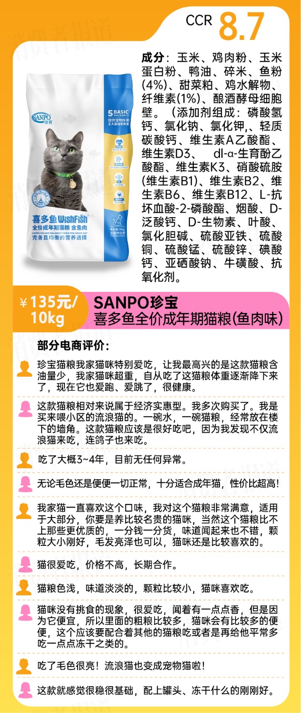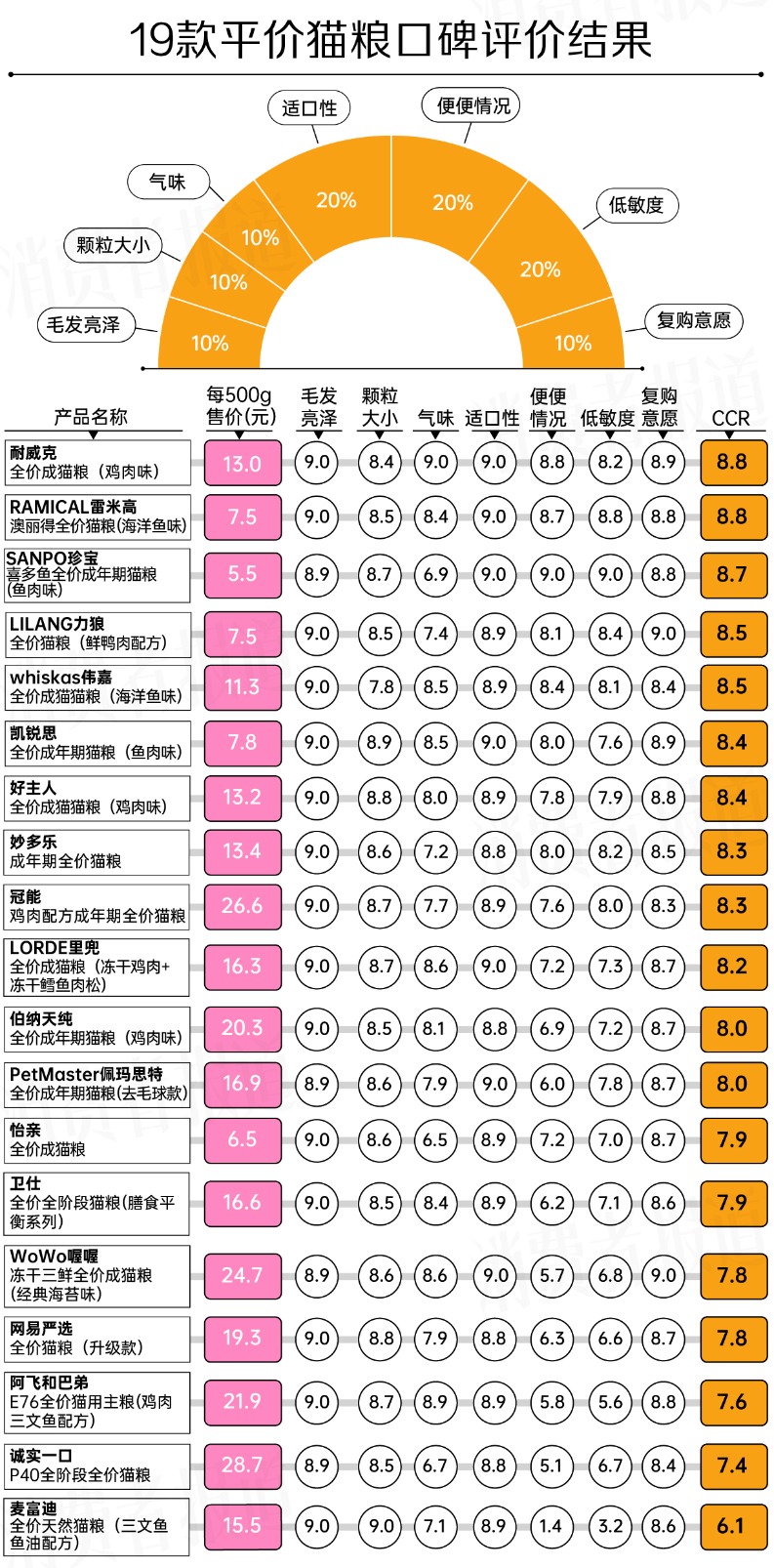 2023年12月,《消费者报道》收集并分析了19款热销的平价猫粮(每500g价格低于30元)在天猫、京东官方渠道共106690条消费者评价数据。