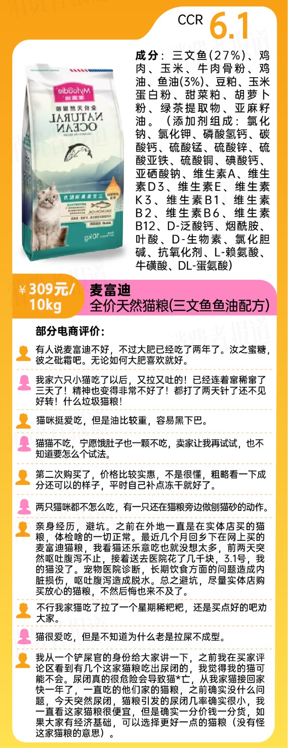 在19款平价猫粮中,麦富迪以CCR得分6.1分位列榜单倒数,槽点较多。