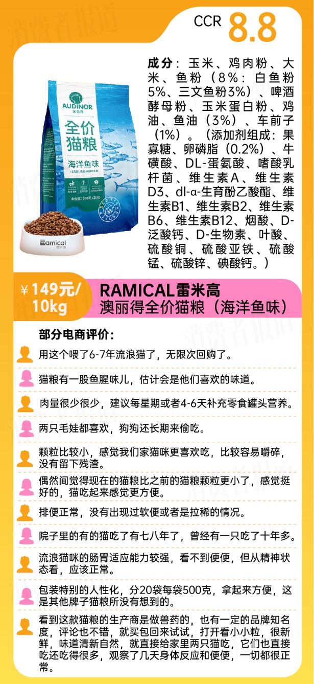 由于成本摆在这里,很多平价猫粮存在动物蛋白含量过低的短板,包括上述3款评价较优的猫粮,也有消费者给出建议:“配上罐头、冻干什么的刚刚好”“偶尔给拌点鸡肉吃得很欢”“猫粮里肉含量太少,需要和进口的掺着喂”“猫粮的成分和营养欠佳,建议混合质量好一点的猫粮一同喂食”等。